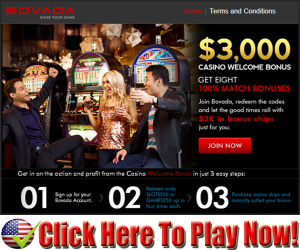 Bovada Casino : $3,000 Free Sign On Bonus : 100 Percent Deposit Match Bonus : Up To $500 Free 1st Deposit Bonus : 400 Plus Casino Games : Real Time Gaming, Rival and BetSoft Gaming Software : U.S.A. Players Accepted...